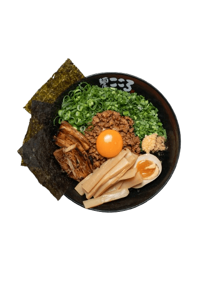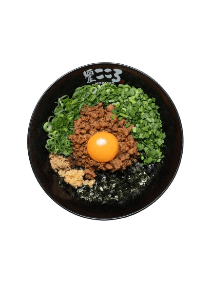Flavourful Chasu Slice, Spicy Minced Pork and Beef, Raw Egg Yolk, Spring Onion, Chives, Seaweed flakes, Grinded Mackerel Fish Powder, Minced Garlic, Kokoro Shoyu and House Made Kokoro Noodle.