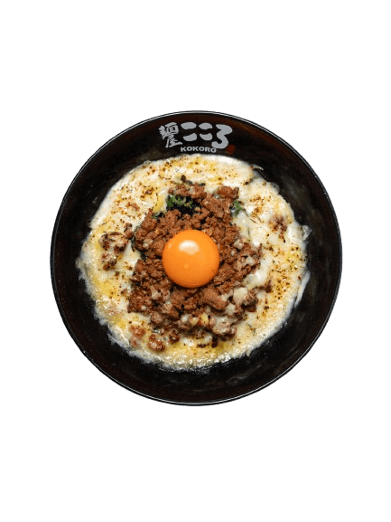 Melted Mix Cheese, Spicy Minced Pork and Beef, Raw Egg Yolk. Spring Onion, Chives, Seaweed Flakes, Grinded Mackerel Fish Powder, Minced Garlic, Kokoro Shoyu and House Made Kokoro Noodle.