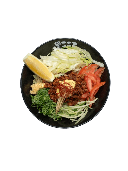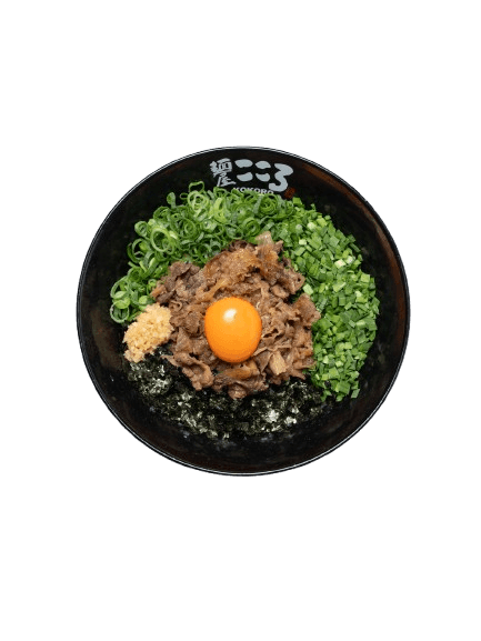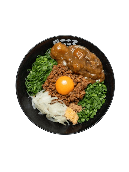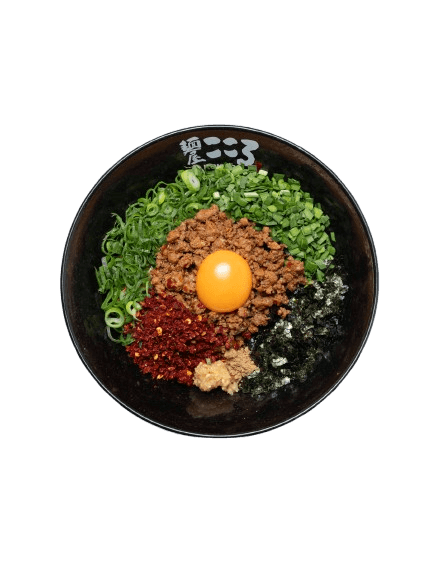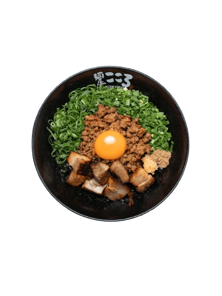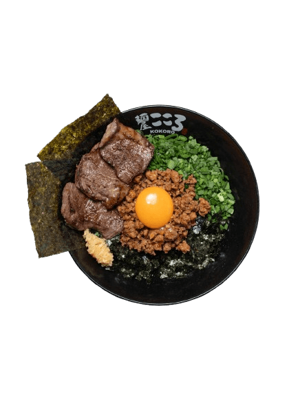 Slow-braised Chashu Diced, Spicy Minced Pork and Beef, Raw Egg Yolk, Spring Onion, Chives, Seaweed flakes, Grinded Mackerel Fish Powder, Kokoro Shoyu and House Made Kokoro Noodle.