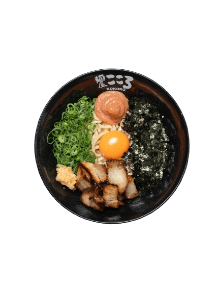Slow-braised Chasu Diced, Mentai Cream, Raw Egg Yolk, Spring Onion, Seaweed Flakes, Soy Milk, Mix Cheese, Grinded Mackerel Fish Powder, Minced Garlic, Kokoro Shoyu and House Made Kokoro Noodle.