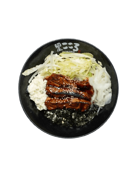 Kokoro's Teriyaki Chicken, Shredded Lettuce, Slice Onion, Seaweed Flakes, Japanese Tar-tar Sauce, Sesame Seeds, Kokoro Shoyu and House Made Kokoro Noodle.